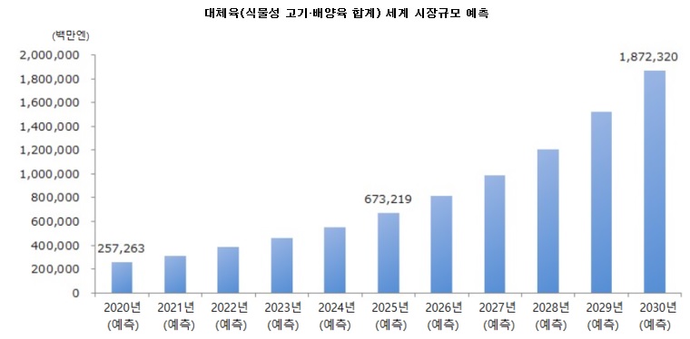 2020년의 대체육 세계 시장규모(식물성 고기·배양육 합계)는 약 2.5조를 예상한다고 합니다.