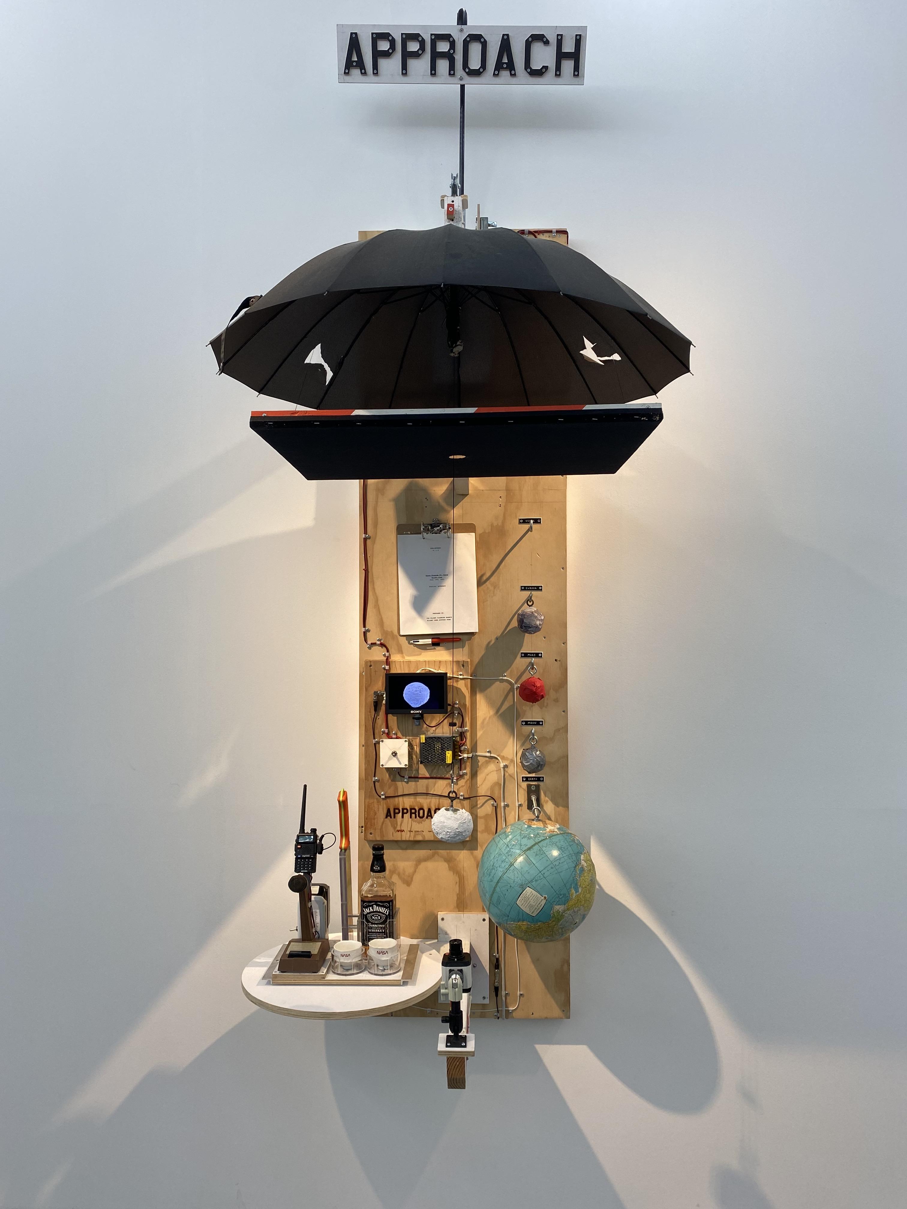 우주선 발사대를 묘사한 작품입니다. 가운에 카메라가 설치되어있어 있고 왼쪽에 영상 패널로 확인할 수 있습니다.