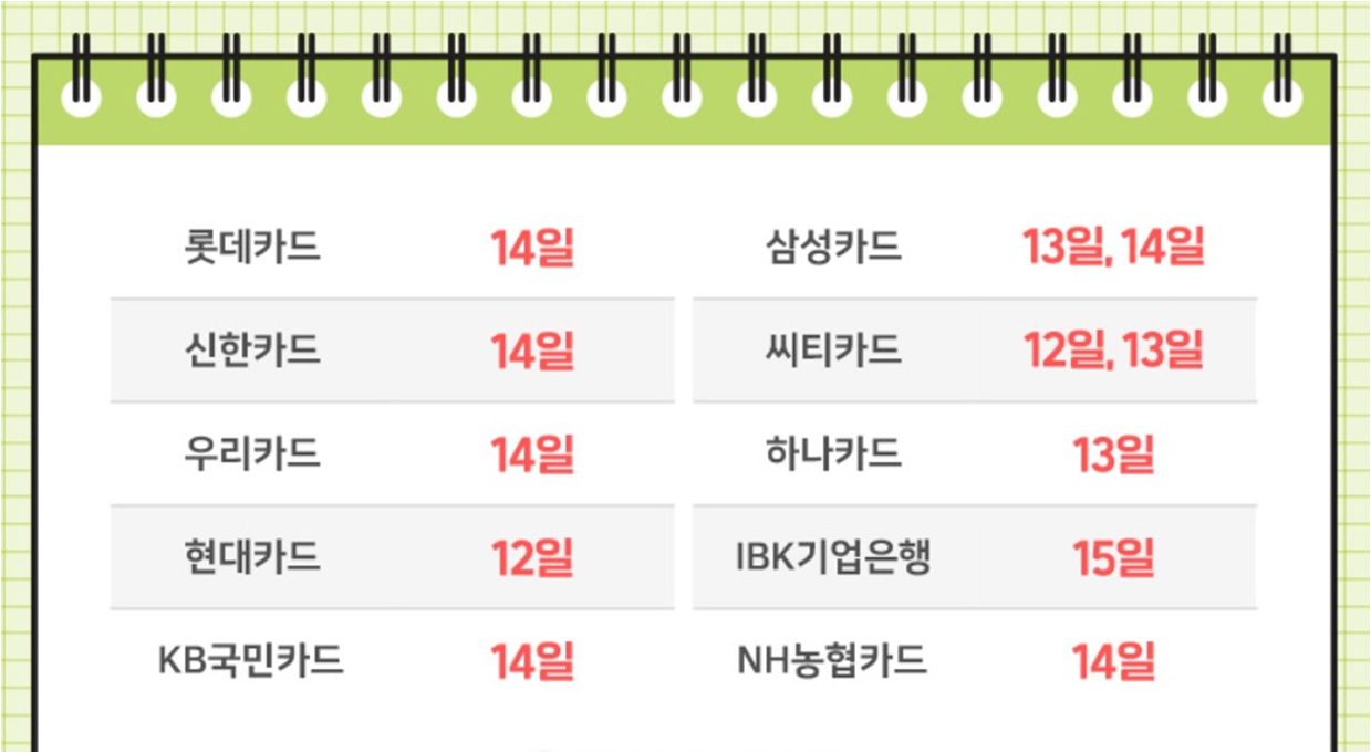 신용카드사별 전월 1일 ~ 말일 기준의 결제일은 다음과 같습니다.